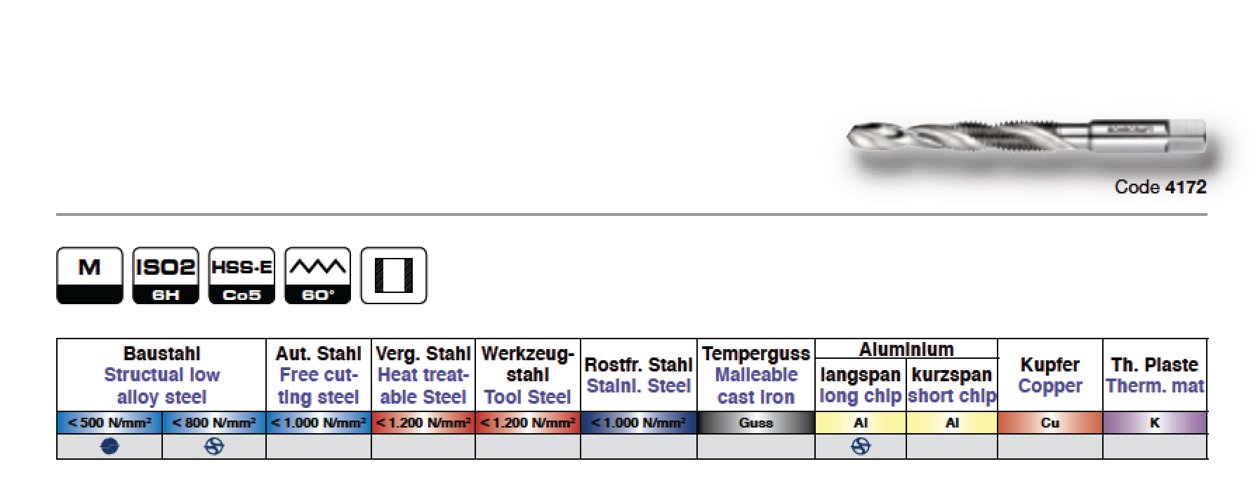 Для сверления и нарезания метрической резьбы от M 3 до М12 за один проход в сталях и материалах с пределом прочности до 800Н/мм2